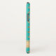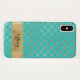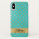 Este elegante Funda de color azul acuático y dorado, Mate Barely There iPhone X Funda, tiene un patrón de coronas de oro y puntos de polka azul verde azulado sobre él que seguro serán un lugar destacado. El funda tiene una amplia banda dorada en la parte inferior que se personaliza con un nombre u otro texto.