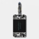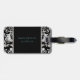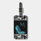 Etiqueta para el equipaje de la señora de la moda hecha en un fondo negro, con gráficos de un borde superior e inferior de damasco de plata y un único Relieve metalizado acuático con aspecto de tacón alto. Personalice el monograma de una letra y el campo de texto para que se adapten a sus necesidades. Una etiqueta de equipajes que no se puede perder.