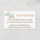 Facilita la vida al huésped de honor y a sus invitados, pidiéndoles que no envuelvan sus regalos y los muestren en la ducha. Esta es una manera maravillosa de liberar a los futuros padres para socializar con sus seres queridos en lugar de, seamos honestos, abriendo torpemente sus regalos durante toda la ducha. Sin mencionar que es un voto a favor de la sostenibilidad. ¡Ganar, ganar, ganar! Incluyó esta tarjeta con su invitación. No se necesita edición.