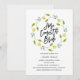 Este diseño presenta una corona floral azul y amarilla que rodea la frase "aquí viene la novia". Los detalles de la próxima boda están abajo y se pueden personalizar. Gráficos ©Huckleberry Hearts