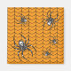 Un fondo naranja brillante crea una base perfectamente temática de Halloween para un patrón repetido de telaraña negra arrastrándose con arañas. Estas arañas, inspiradas en la falsa viuda, tienen un cráneo blanco brillante en sus abdomen y otras marcas blancas en su cuerpo y piernas.
