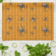 Un fondo naranja brillante crea una base perfectamente temática de Halloween para un patrón repetido de telaraña negra arrastrándose con arañas. Estas arañas, inspiradas en la falsa viuda, tienen un cráneo blanco brillante en sus abdomen y otras marcas blancas en su cuerpo y piernas.