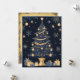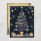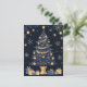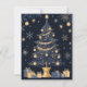 Esta tarjeta de Navidades de diseño elegante cuenta con un árbol de Navidad elegantemente decorado con adornos y luces dorados, coronado por una estrella dorada brillante. El árbol se sitúa de forma prominente en un fondo oscuro con patrones de hojas sutiles y pequeñas estrellas doradas que cuelgan a su alrededor. En el fondo, "Feliz Navidad" está escrito en un elegante guión dorado. La parte delantera de la tarjeta capta el espíritu festivo con su diseño intrincado y festivo. En la parte posterior, la tarjeta presenta una página en blanco de estilo vintage con copos de nieve decorativos, lo que proporciona un amplio espacio para escribir un mensaje personal y sincero. Perfecto para enviar cálidos deseos de vacaciones a sus seres queridos.