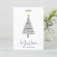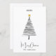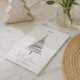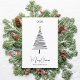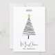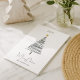 Fondo blanco, y un árbol de Navidad dibujado a mano negro con una estrella amarilla. Feliz Navidad escrito con una tipografía de letra manuscrita de moda. Reverso: añade tu nota y tus nombres.