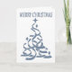 Un árbol de navidad abstracto en azul con las estrellas y las decoraciones azules, en un fondo blanco llano y un saludo estacional en letras enrrolladas.