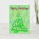 Un árbol de navidad abstracto en verde claro con una estrella amarilla y decoraciones azules, en un fondo anaranjado con una circular paten y un saludo estacional en letras enrrolladas.