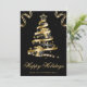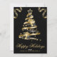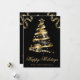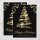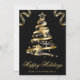 Diseño de árbol de Navidad con cinta brillante negra y dorada elegante sobre un fondo negro con efecto bokeh, copos de nieve y esquinas de cinta, y una foto personalizada que se puede personalizar.
