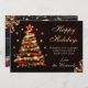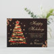 Diseño elegante de árbol de Navidad con cinta brillante roja y dorada sobre un fondo bokeh rojo oscuro con copos de nieve y esquinas de cinta y una foto personalizada que se puede personalizar.
