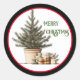 Pegatina en un diseño tradicional de un árbol de Navidad en una olla con regalos a la espera de ser abierto.