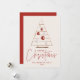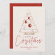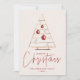 Elegante tarjeta de vacaciones no fotográfica con un árbol navideño de madera color agua con marfil y adornos de vidrio rojo oscuro con un fondo crema moteado. "Feliz Navidad" se muestra en letras de estilo rojo oscuro con tu nombre y el año que se muestra a continuación. La tarjeta se invierte para mostrar tu mensaje personal en texto blanco sobre un fondo rojo oscuro.