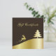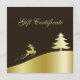 Elegante ilustracion de Navidades dorados con una silueta dorada de reno y árbol con saludo de Feliz Navidad con fondo marrón.