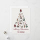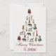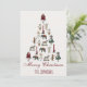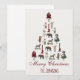 Un árbol de Navidad hecho de juguetes antiguos: muñecas vestidas de rojo, verde o blanco, caballos de juguete, osos de peluche, monos, elefantes y payasos y también velas rojas. En la base, hay tipografía: el mensaje "Feliz Navidad" escrito en una elegante letra caligráfica roja y debajo, el nombre en letras rojas a mano.