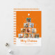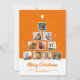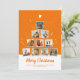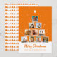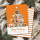 Tarjeta de collage de fotos de moda estilo Instagram con espacio para 10 fotos familiares cuadradas en forma de árbol de Navidad coronado con un corazón caprichoso. La parte posterior muestra un patrón arbóreo mínimo escandinavo en un naranja retro brillante. Una fuente manuscrita angustiada lee Feliz Navidad arriba espacio para un mensaje personalizado, nombre de familia y año.