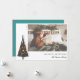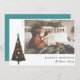 Árbol de Navidad moderno ilustrado de mediados de siglo, tarjeta de foto de vacaciones. Características de la tarjeta, una foto en la parte delantera y dos fotos enmarcadas en la parte posterior con la coordinación del respaldo de color azul retro aqua. Líneas de texto de plantilla para el saludo, nombre y año.