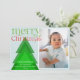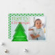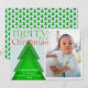 Sencilla tarjeta de Navidades moderna con una sola foto enmarcada en un borde blanco sobre un fondo azul pálido de hielo. Un simple árbol de Navidad geométrico con tonos verdes mezclados añade un detalle único. Una brillante "feliz Navidad" verde y rojo en un tipográfico con algunas florituras festivas. Personaliza con un breve mensaje y tus nombres, y el año. La parte posterior de la tarjeta presenta un patrón de árbol en una combinación de colores coincidente.