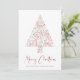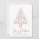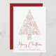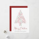 Una carta de saludo de vacaciones mínima, moderna y hermosa, con un resumen de árbol de Navidad compuesto por verduras estacionales rojas, verde azuladas, verdes, rosas y azules, fresas y azules, y corazones y estrellas. "Feliz Navidad" está escrito debajo de un elegante guión rojo bonito, y debajo se puede personalizar con el nombre de tu familia.