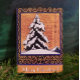 Esta acogedora escena invernal incluye una cabaña cubierta de nieve y un árbol de hoja perenne; y esta imagen vintage está rodeada por un borde decorativo de cubierta de libro.