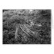 Una tarjeta con una foto en blanco y negro de un árbol cortado en pilas en el subcrecimiento. ...