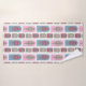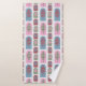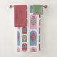 El conjunto de toallas incluye un lavabo verde, una toalla de remolacha y una toalla de baño con un diseño Art Déco de formas cúpulas repetidas con formas de árbol en su interior. Si te gusta el diseño pero prefieres colores diferentes, envíame un mensaje.