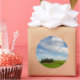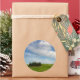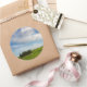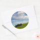 Pegatina de recuerdos redondo de un grupo de cipreses en un paisaje con colinas verdes y flores amarillas bajo hermosas nubes blancas cerca de Torrenieri en el Val d'Orcia (valle de Orcia) en la Toscana, Italia.