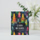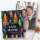 Tarjeta de saludo de foto de vacaciones de Navidad con un patrón de árboles de Navidad coloridos sobre un fondo azul oscuro. Texto caprichoso "Felices Fiestas" y sus nombres personalizados y año.