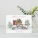 Escena navideña rústica y acogedora con acuarela de granero rojo decorado con una corona festiva, un muñeco de nieve alegre, puerta de madera, cerca de piedra, cardenal rojo y árboles cubiertos de nieve. Personaliza con tu propio texto delante y detrás.