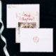 Los pinos de Navidades rosas se encuentran en un patrón de acuarela vintage. Esta es una escena encantadora con copos de nieve cayendo. El texto del script rosa es todo editable. Asegúrese de cambiar el nombre y el año de ejemplo.
