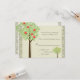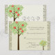 invitación de boda RSVP. Ideal para bodas de primavera y verano. Árboles frutales rojos y amarillos en fondo verde claro, con borde decorativo.