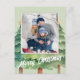 Este diseño presenta una alegre postal navideña, con acuarela, de fondo verde simple, y una plantilla de una foto, un simple y elegante, lindo capricho, con un árbol de Navidad, con rústico, pino y tipografía caprichosa