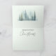 Esta tarjeta de Navidad con acuarela pastel presenta una escena de bosque nevado con pinos imponentes.