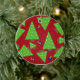 Un diseño divertido con fantásticos árboles de Navidad con puntos de nieve blanca. Ornamentos rojos y azules con diseños de copos de nieve sobre un fondo rojo.