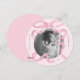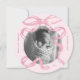 Tarjeta de Navidad redonda única. Tarjeta de Navidad con foto de arco de bebé rosa perfecta para la primera Navidad de los bebés. El diseño presenta un arco rosa coquette de moda enmarcando tu foto personalizada. Personaliza todo el texto con tu saludo de Navidad. Espacio en la parte posterior para un mensaje más largo también.