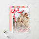 Envía a tus seres queridos una tarjeta de Navidad caprichosa y linda en rojo brillante. Cuenta con una foto familiar en arco en la parte delantera con un lazo de cinta roja linda. El fondo tiene rayas rojas verticales. Personaliza los saludos y la foto en la parte delantera.
