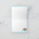 No mandes una nota...¡envía un arco iris! Esta adorable tarjeta de notas muestra un fondo azul cielo con un gran gráfico arcoiris. El arcoíris colorido tiene nubes blancas onduladas y dos corazones rosados. Hay un marco azul en el interior de la tarjeta de nota en blanco junto con un pequeño gráfico arcoiris y mucho espacio en blanco para que escribas tu mensaje alegre.