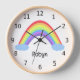 Este es un reloj muy bonito para una habitación de chica. Está rodeado de madera natural y de un fondo blanco, con un arco iris de color pastel sobre nubes azul pálido. Puedes personalizarlo con tu nombre, y tiene números negros y manos negras fáciles de leer.