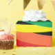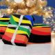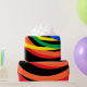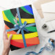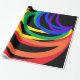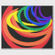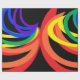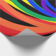 Este papel de envolvimiento festivo presenta un patrón abstracto tridimensional de lunas de arcoiris en colores rojo, naranja, amarillo, verde, azul y morado sobre un fondo negro.