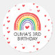 Arcoiris y corazones sobre invitación de la fiesta de cumpleaños sello pegatina