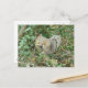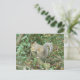 Esta bonita postal muestra una fotografía de una adorable ardilla gris esponjosa agarrando una bellota y sentada en un árbol en el bosque.