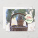 Foto de una ardilla gorda sentada en una canasta en la nieve que cae diciendo "Feliz Navidad" en un globo de voz. La nieve se está acumulando en esta foto de invierno con un fondo blanco de nieve caída y ramas verdes de árboles verdes. "Feliz Navidad" está escrito en rojo y rojo. Esta foto de una ardilla en invierno se puede personalizar e imprimir en diferentes productos fotográficos.