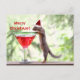Foto hilarante de una ardilla que celebra navidad llevando un gorra y una situación rojos y blancos de Papá Noel de puntillas, alrededor para tener otro sorbo de un cóctel rojo de un vidrio verde enorme. Las ramas de árbol de navidad rodean la ardilla. ¡Es feliz que la hora y es las vacaciones, así que es hora de celebrar con alegrías pocas de una bebida…!
