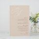 Una hermosa tarjeta de menú boda basada en tipografía con sus iniciales en letras de guiones sobredimensionadas en la parte superior, en tono de tonos para un efecto de marca de agua. Personalice los elementos de menú que se encuentran debajo, alineados a la derecha. El color arena es una elegante mezcla de tonos tierra, con letras de crema pálida y barro de terracota sobre un suave fondo de arena beige.