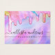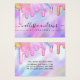 Esta tarjeta de exhibición de aretes colgantes femenina y glamorosa es la forma perfecta de estilizar su empaque y agregar su propio estilo y personalidad. Cuenta con gotas de purpurina gruesa de color arcoíris de unicornio brillante impresas en falso sobre un fondo iridiscente holográfico. La tipografía es un elegante guion cursivo con una fuente serif moderna para combinar. La paleta de colores incluye rosa, melocotón, azul, púrpura, amarillo y coral. Es chic, bonita, única y lujosa; la forma perfecta de promocionar su negocio y estilizar su material de marketing y publicidad para sus clientes. (Los agujeros de los aretes son solo marcadores impresos, la perforación debe ser realizada por el cliente)