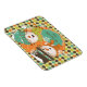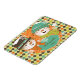 Nuestro imán de flexi personalizado de Argyle Snowmen Holiday incluye una pareja de muñecos de nieve con sombrero superior, gorra de invierno, bufanda rayada y narices de zanahoria sobre un fondo de patrón naranja, verde azulado, mostaza, marrón y crema, pequeños puntos de polka sobre naranja con copos de nieve de blanco, y un banner verde azulado que puedes personalizar fácilmente con un nombre u otro texto.