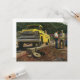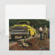 Ilustración vintage de negocios de la industria de la construcción con un arquitecto y contratista general parados junto a una camioneta de trabajo amarilla. Los hombres de cuello azul están revisando algunos planos en una obra antes de que llegue el inspector para dar el visto bueno al proyecto.