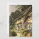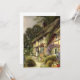 Ilustración arquitectónica vintage con una imagen clásica de una casa de campo inglesa con techo de paja y hermosos jardines ingleses y una mujer parada en los escalones delanteros. Podría ser una hermosa posada campestre de cama y desayuno.
