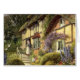 Imagen arquitectónica de ilustracion de época con una casa de campo clásica inglesa con techo de paja y bonitos jardines ingleses y una mujer parada al lado de los escalones. Podría ser una hermosa posada rural.
