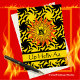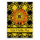 Arriba Helly Aa, tarjeta de saludo del festival de incendios de Shetland con diseño de sol y fuego. El Guizar Jarl está centrado dentro del sol flotando en un ardiente diseño de cielo. Celebración con un tema escandinavo nórdico a fines de enero. Arte, imagen y verso copyright © Shoaff Ballanger Studios, 2023.