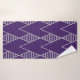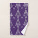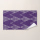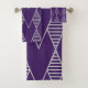 Este juego de toallas tiene un diseño Art Deco de diamantes, algunos con líneas horizontales, en plata sobre un campo azul.