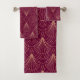 Art Deco pattern with gold geometric fan motifs on a maroon background, creating an elegant, symmetrical design with vintage sophistication.