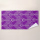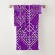 Este conjunto de toallas tiene un diseño Art Déco de formas diamantíferas y líneas plateadas en un campo de color púrpura.